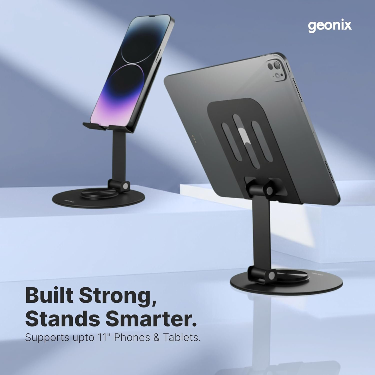 This image showcases a sleek and modern adjustable metal device stand designed to hold smartphones, tablets, e-readers, or small books with stability and style. The stand features a minimalist matte black finish that gives it a professional and contemporary appearance, making it suitable for office desks, study tables, kitchen counters, or bedside setups. Its clean lines and simple geometric structure emphasize functionality while maintaining an elegant aesthetic.