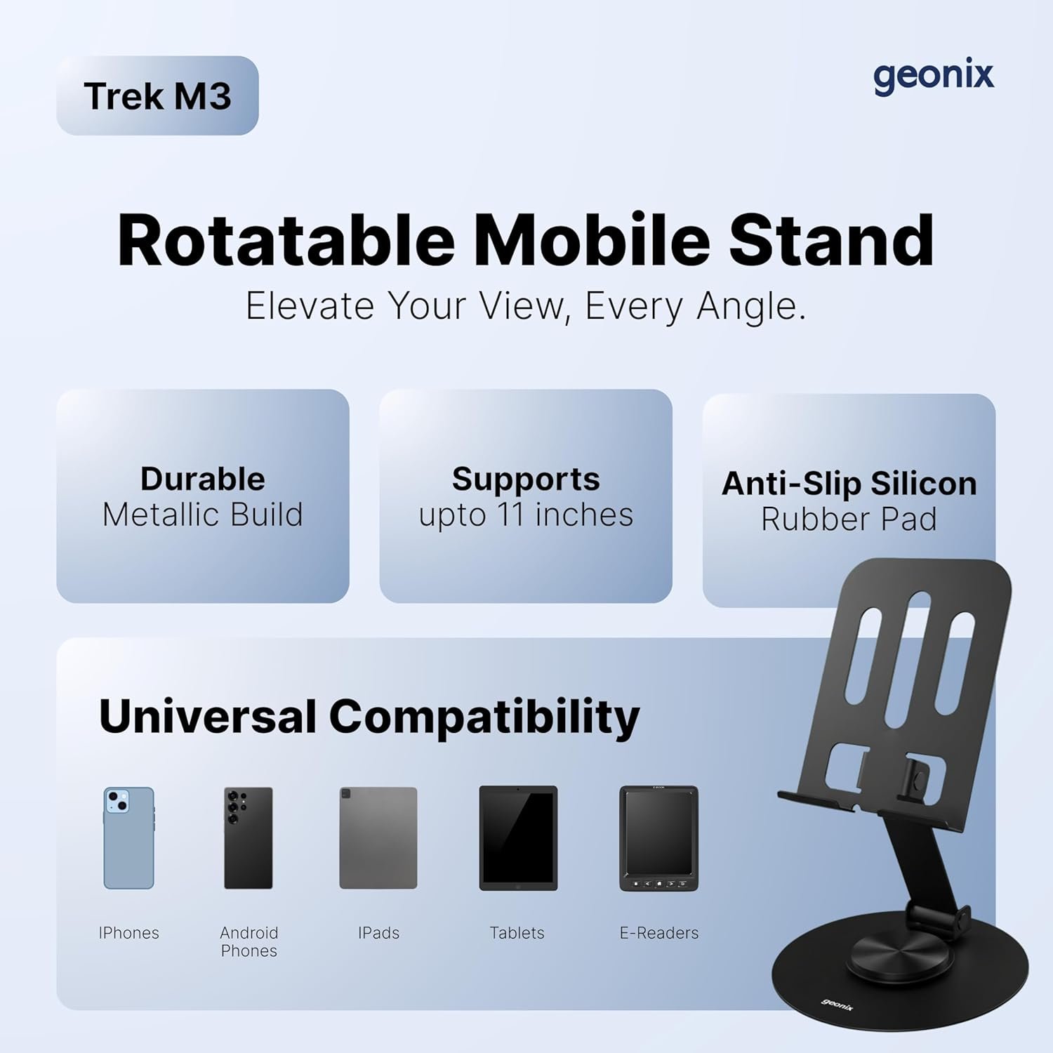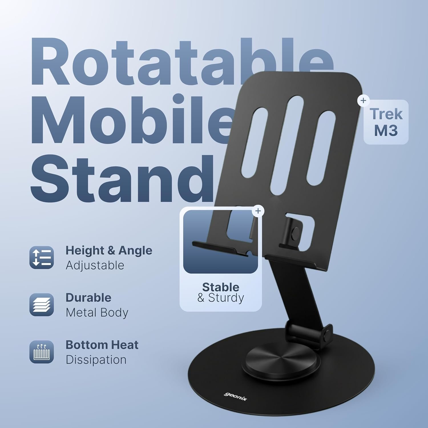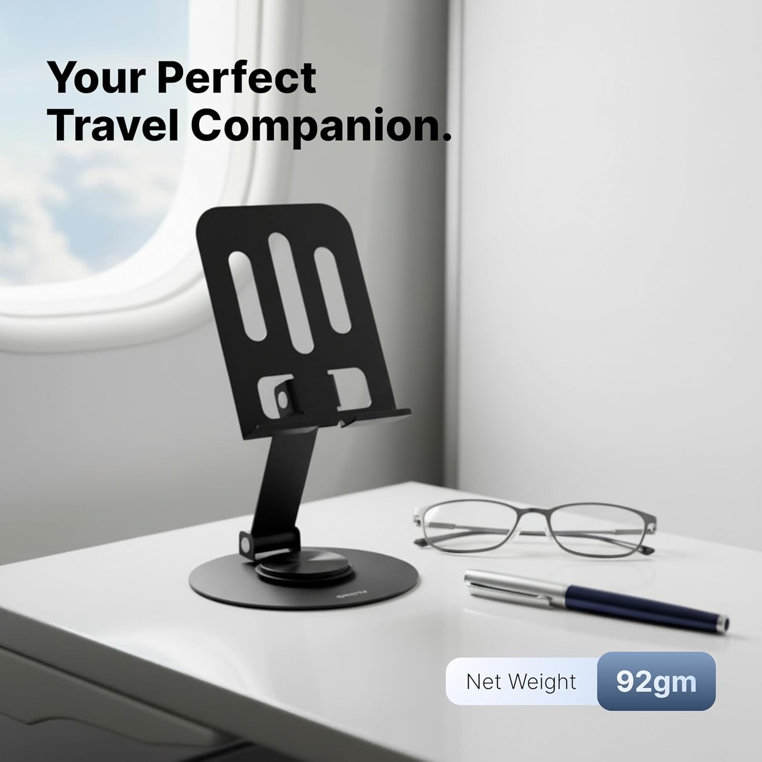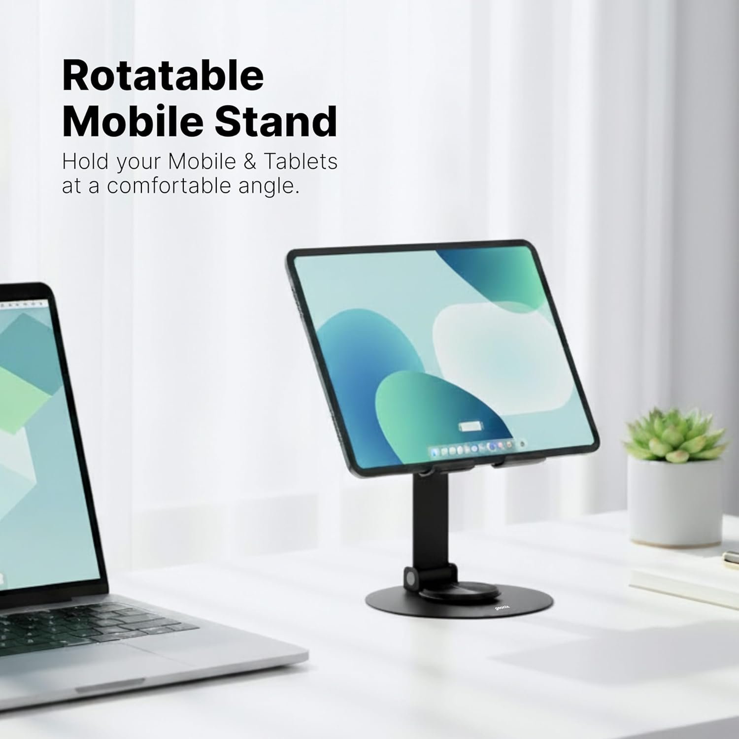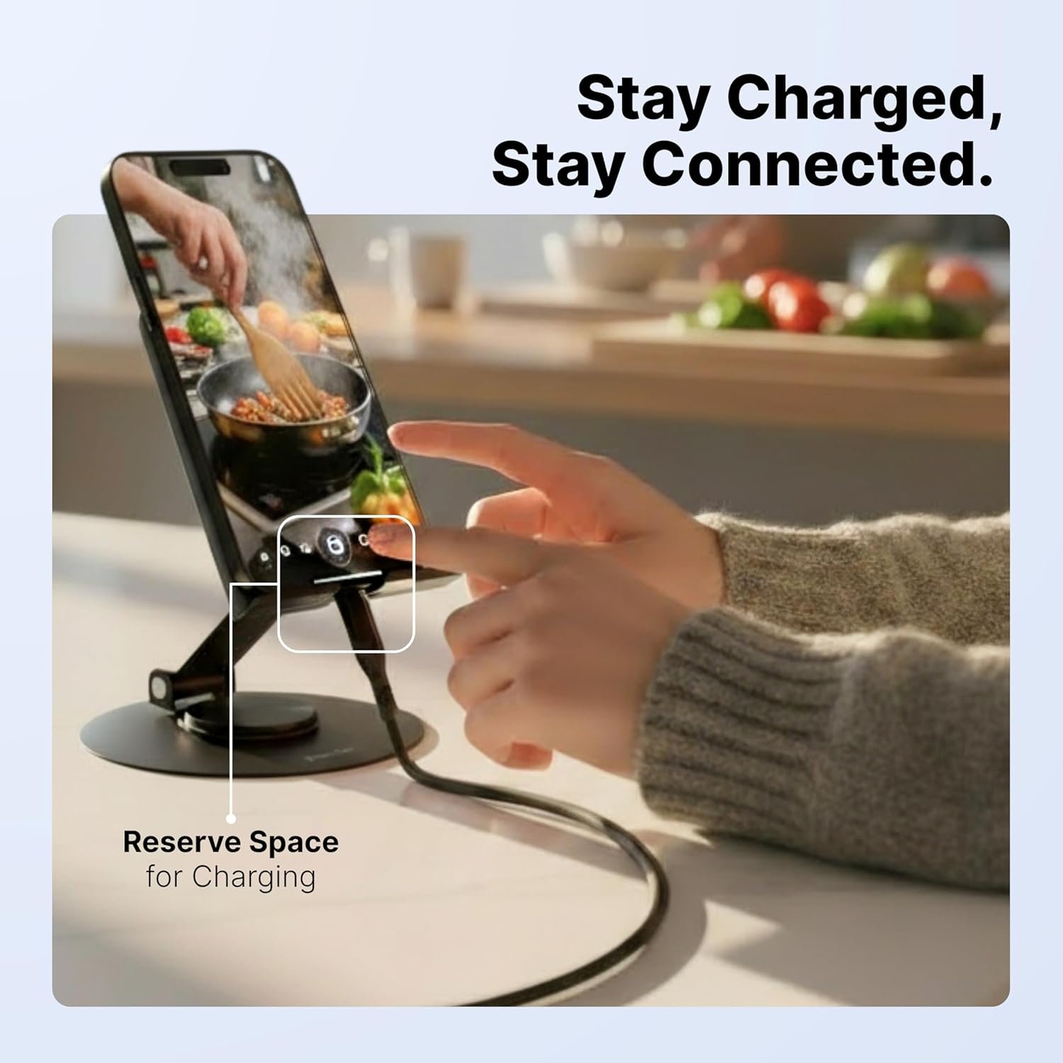 Extending upward from the base is a sturdy adjustable arm. The arm is connected to the base with a hinge mechanism that allows the angle to be modified according to the user’s preference. This adjustable joint enables flexible positioning, making it easy to tilt or elevate the device for comfortable viewing. Whether used for video calls, watching movies, reading digital content, or following recipes, the adjustable feature helps reduce neck and eye strain by allowing the screen to be aligned at the ideal height and angle.