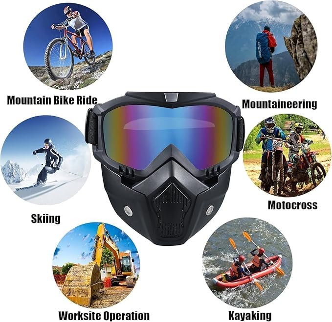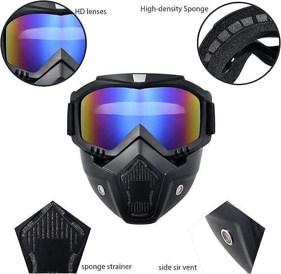 - COMFORTABLE DESIGN : With Detachle mask : Ventilation mesh on the mask optimizes flow of air. Soft sponge padding around the frame makes the riding goggles more comfortable. Motorcycle goggles with a detachable mask design is easy and convenient to install and use, whatever use them together or separately. The perfect streamlined design and Wide inner space offer a crystal clear broad vision, allows you to wear a myopic lens comfortable.