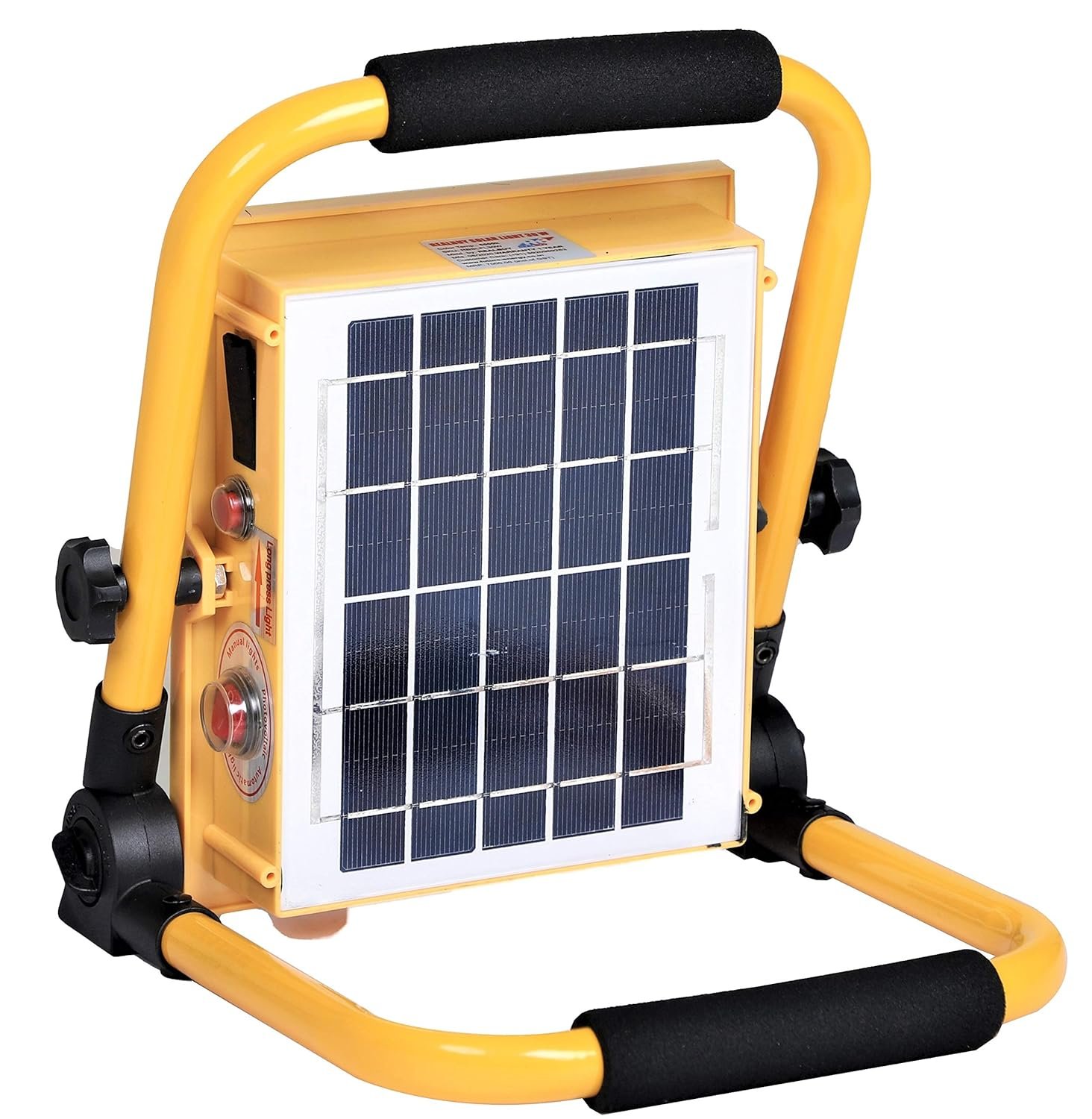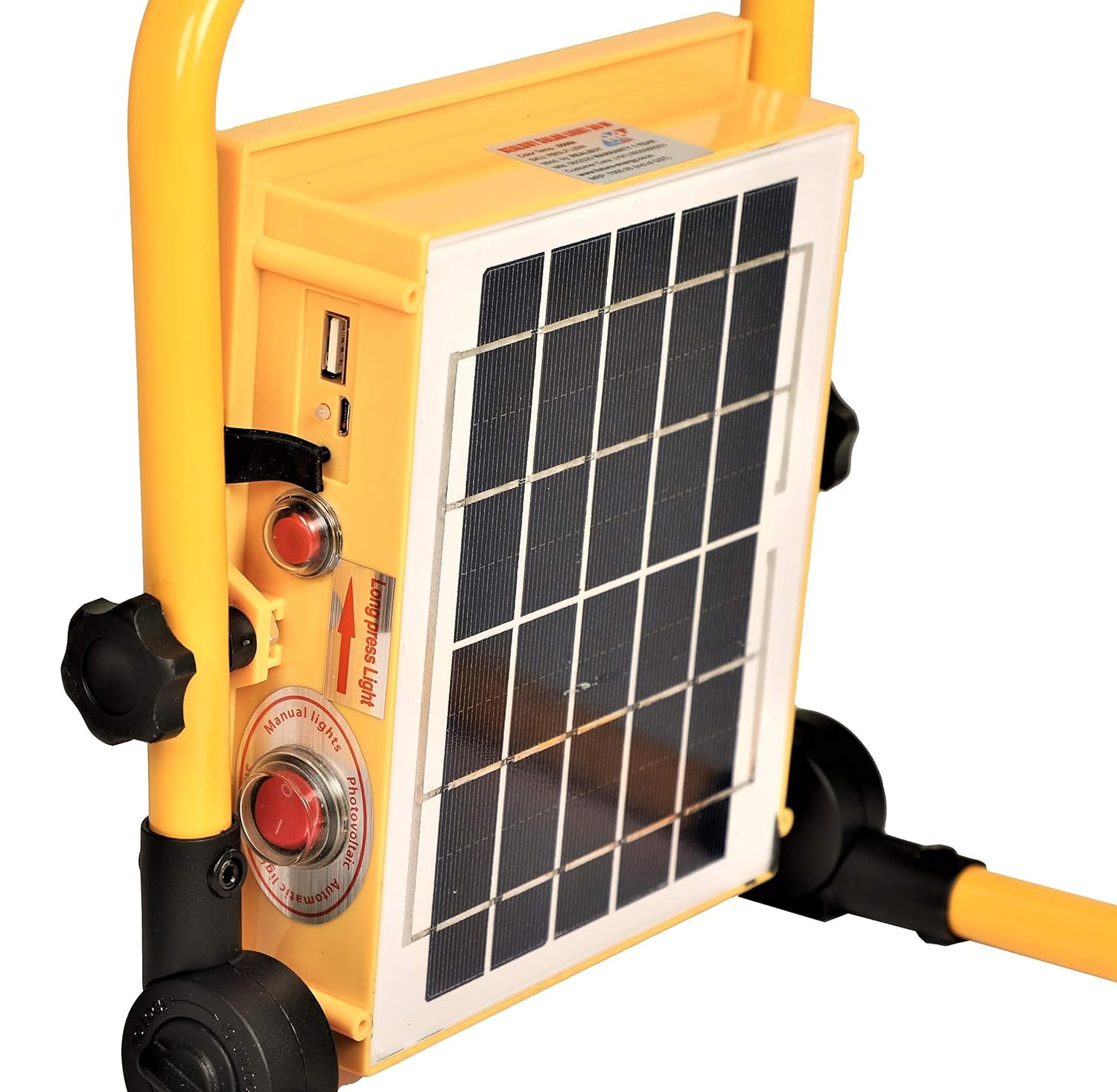- DUAL CHARGING: Solar and 220V AC (through AC USB Charger) || Truly VERSATILE and MULTI-FUNCTIONAL: Can be used a portable outdoor camping light / outdoor-indoor emergency light / portable work light / search light cum flood light || 360 degree adjustable lighting head with 180 degree adjustable mounting stand || MOBILE CHARGING OPTION || Offers multiple usage and carry methods making this an ideal and must-have portable emergency flood light