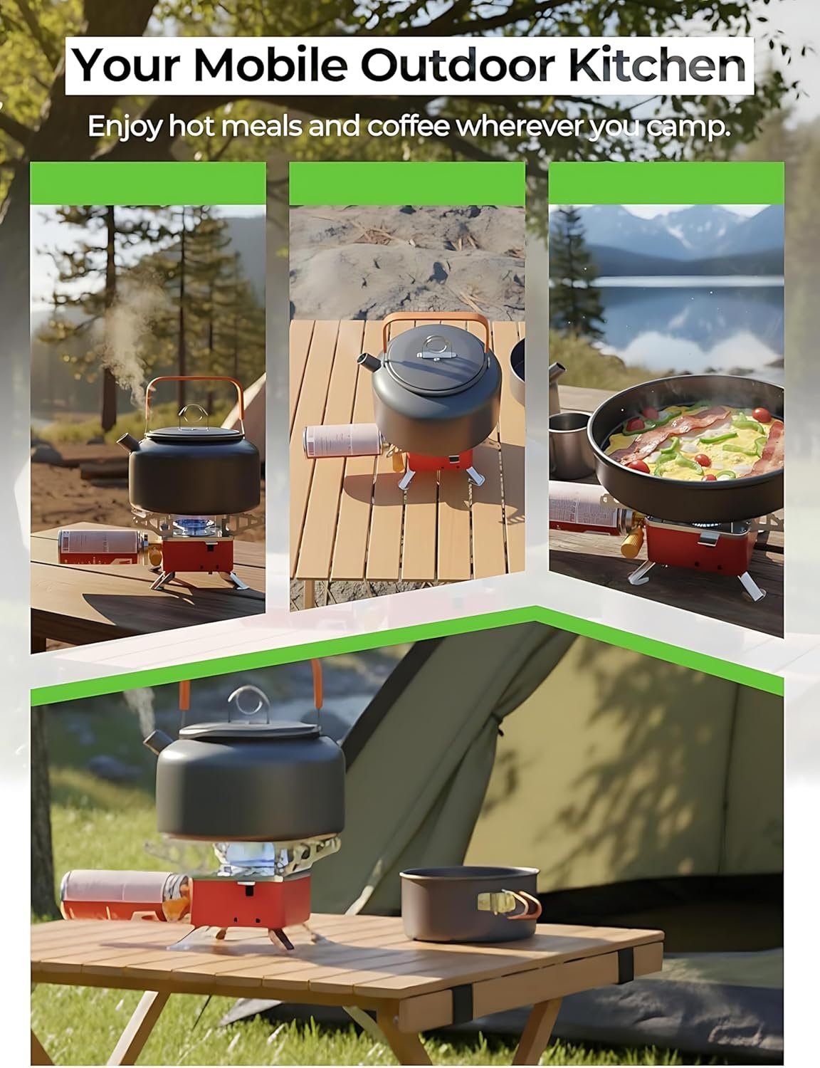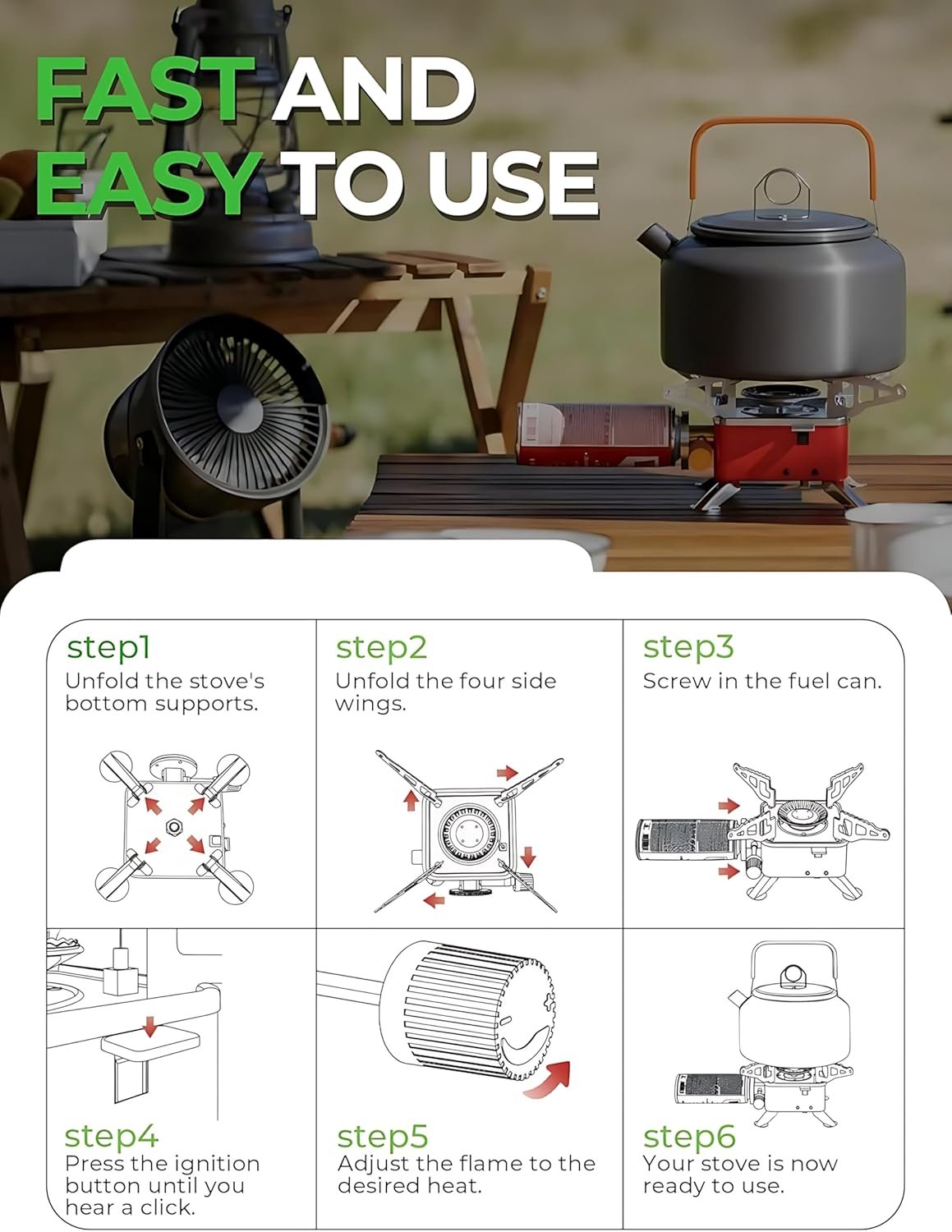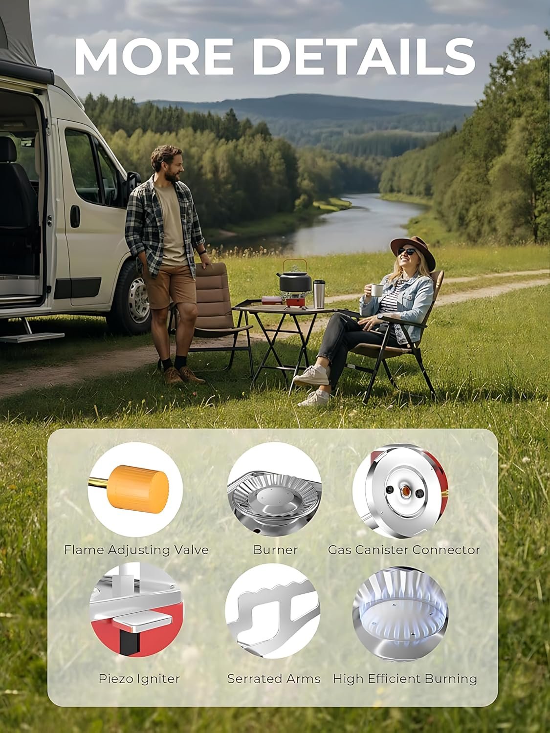 - ATTRACTIVE DESIGN – This Windproof Butane Gas Burner Is Stable And Safe Because This Portable Camping Stove Is Having The Weight Carry Foot System. This Portable Stove Is Having A 4-Arm Base Support System- It Is Very Supportable For Cookware To Cooking The Food.